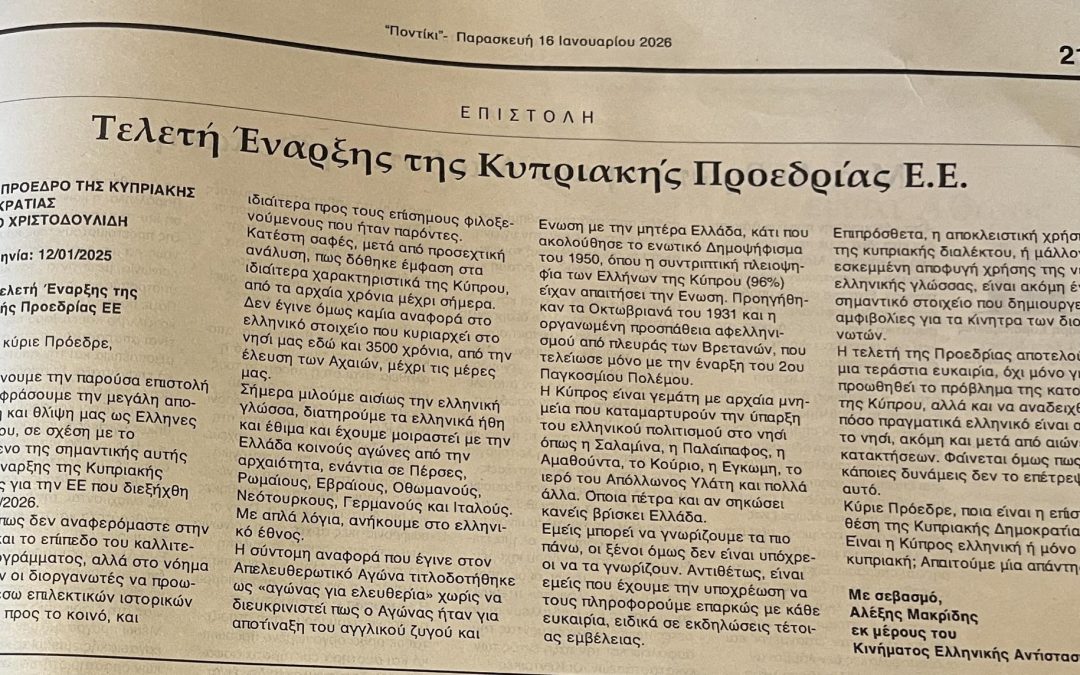 Σας κοινοποιούμε την παρούσα επιστολή για να εκφράσουμε την μεγάλη απογοήτευση και θλίψη μας ως Έλληνες της Κύπρου σε σχέση με το περιεχόμενο της σημαντικής τελετής έναρξης της Κυπριακής Προεδρίας για την ΕΕ που διεξήχθη στις 07/01/2026.